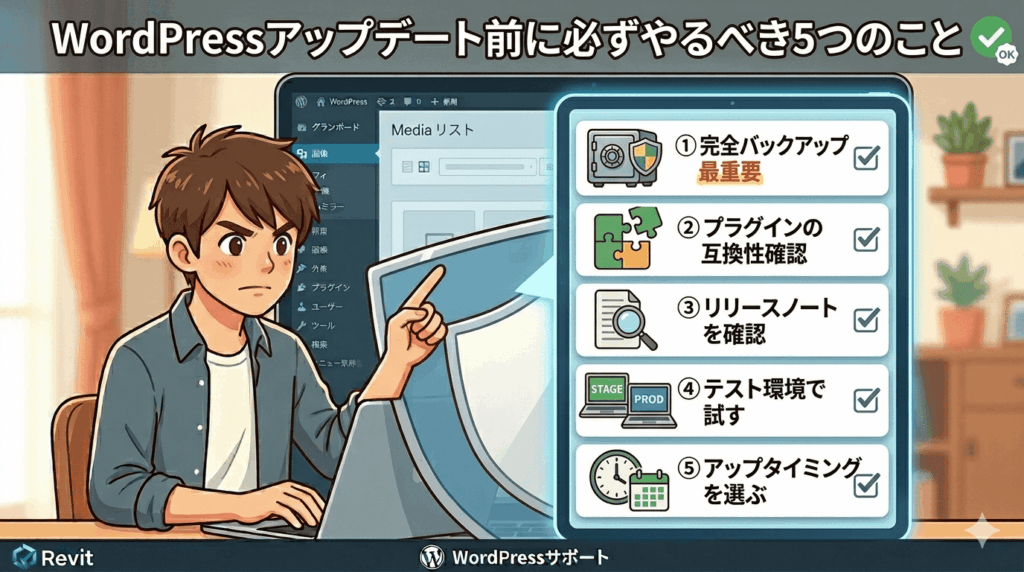 WordPressのアップデートは重要なセキュリティ対策ですが、準備なしに実行すると取り返しのつかないトラブルになりかねません。バックアップ・互換性確認・タイミングの選択が最低限必要です。