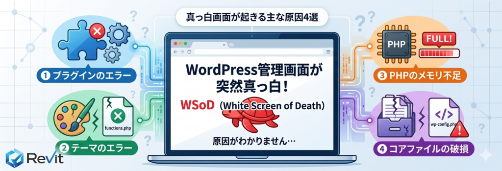 真っ白画面(WSoD)が起きる主な原因は以下の4つです。